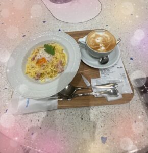 もみじ🍁エクセシオールカフェに行ってカルボナーラ食べたんだけど量多すぎて死にそうになった😅😅笑
