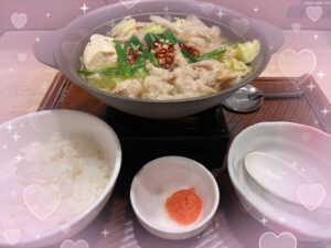 ぷりぷりのモツにキャベツ、ニラ、豆腐がたっぷり入ってて、唐辛子のピリ辛が最高なの🔥